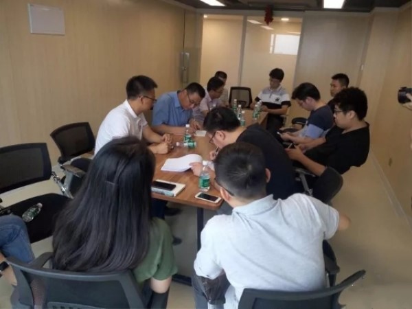 工作人员脚踩大巨龙pvc地板,观看各种细节,感受大巨龙地板魅力,现场验收,现场会议。