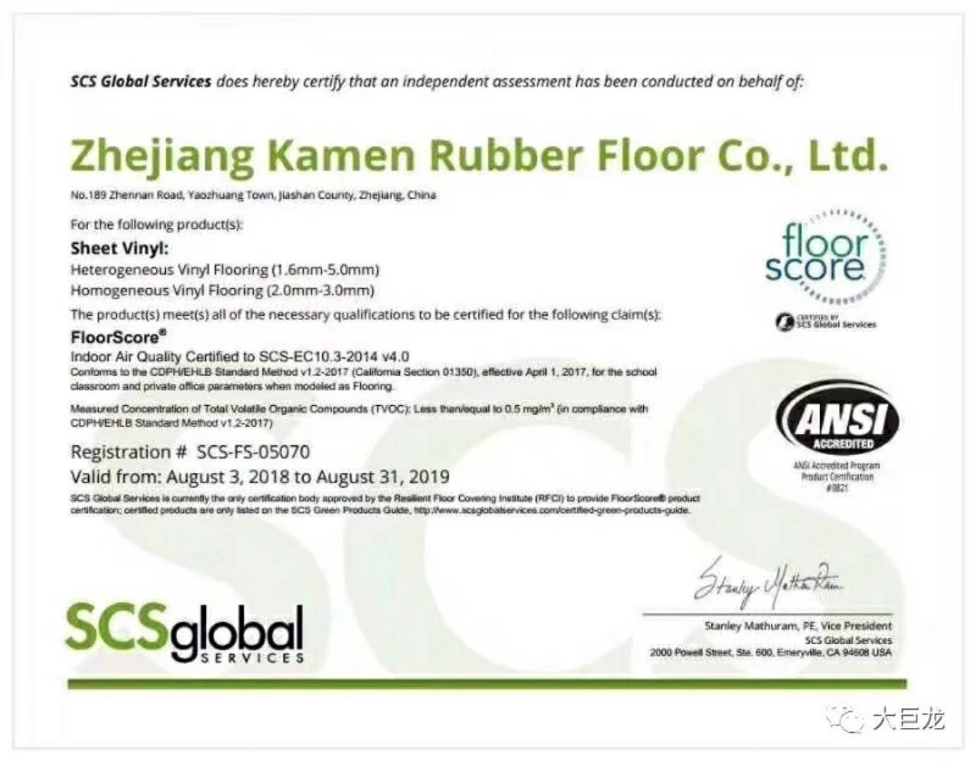 日前,大巨龙pvc地板厂家又获得一个“新签证”。历经几个月严谨现场审核、产品抽样检测和资料审查,大巨龙集团旗下PVC复合地板和同质透心地板均顺利通过美国科学认证体系(SCS)评价并获得FloorScore认证证书。