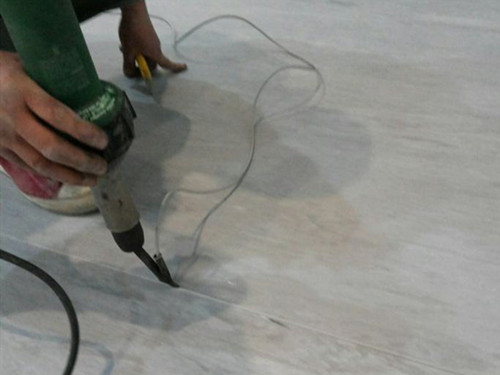 6.开槽焊线,使用电动开槽机或手工开槽,开槽宽度不得大于3毫米,使用专用热熔焊枪焊接缝隙,然后铲平焊线。