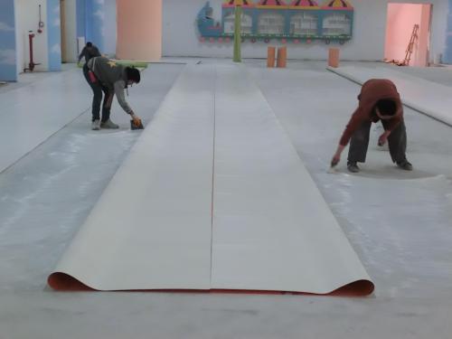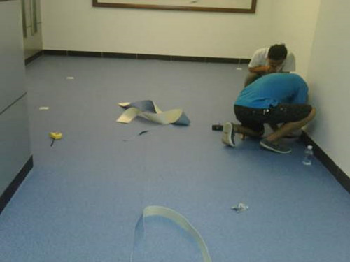 4.粘贴:待胶水达到可以粘接的程度后,将卷材地板一条一条平推下去,然后使用大压辊滚压,压实为止。